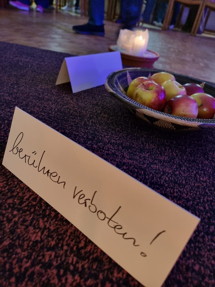 Zu Beginn des Gottesdienstes wurde jedem Besuchenden ein Apfel mit einer Banderole geschenkt, auf der stand: „Nicht essen.“ Viele nahmen es erstaunt zur Kenntnis. „Es ist schon gut, dass man nicht alles sofort darf“, meinte eine Besucherin mit einem Schmunzeln, ehe sie sich einen Platz suchte. Dieser kleine Impuls führte mitten hinein ins Thema des Abends: der altbekannten, aber immer wieder überraschend aktuellen Erzählung von Eva, der Schlange und dem Baum der Erkenntnis.