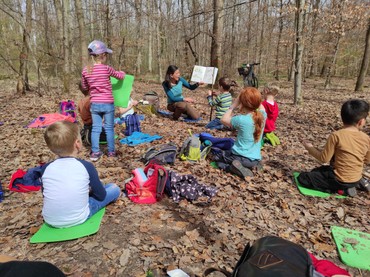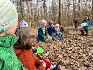 Ich verlasse die Gruppe – die mir später erzählen wird, wie aufregend die Busfahrt war – und treffe sie etwa eine Stunde später im Wald wieder. Dort stecken kleine Stöckchen verheißungsvoll im Boden, doch die Kinder sind mittlerweile bei einer ganz wesentlichen Aktivität: der Vesperpause. Stolz präsentieren mir alle ihre bunt gefüllten Vesperdosen und bieten mir Erdbeeren, Tomaten, Gurken und sogar einen Schluck aus der Trinkflasche an. Frisch gestärkt kann die Aufmerksamkeit nun wieder dem Wald um sie herum geschenkt werden. Die Waldpädagogin fordert alle auf, ganz leise zu werden und ganz genau hinzuhorchen. Das Schnattern verstummt und die Geräusche des Waldes sind deutlich wahrnehmbar. Blätterrascheln, irgendwo ein Hund, unterschiedliche Vogelstimmen. Ob sich ein Specht hören lässt? Wie macht der eigentlich? Und wie viele unterschiedliche Vögel sind insgesamt zu hören? Die Schätzungen liegen zwischen zwei und zwölf, am Ende einigen sich alle auf vier. Denn so langsam erwacht der Wald jetzt im Frühjahr zum Leben. Mit einem Spiel wird verdeutlicht, nach welchen Kriterien die Vögel ihr Futter suchen und wir sind alle enttäuscht, dass die vielen bunten Stäbchen, die wir mühsam in unser Nest gebracht haben, gar nichts wert sind – nur die wenigen braunen Stäbchen stehen für das essbare Futter.