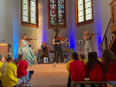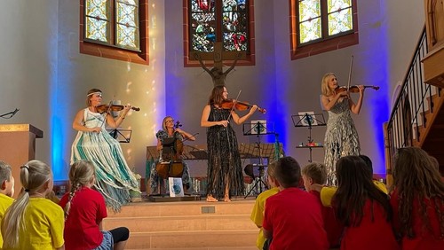 Das Streichquartett aus dem hohen Norden der Republik entführte Kinder und Eltern auf eine Reise durch den Ozean, bei der sich der sympathische Wal und die neugierige Wassernixe Begleitung suchten für ihre Aufgabe, das Meer vom Müll zu befreien. Schnell merken sie, dass es viele braucht - und schnell merkten alle Besuchenden an diesem Sonntagnachmittag, dass auch sie damit gemeint sind. Mit eingängigen Bewegungen und ansprechender Melodie wurden im Laufe des Nachmittags so ganz viele zu den Oceankids, die etwas gegen die drohenden Umweltprobleme dieser Zeiten tun können. Zum großen Finale am Ende des Musicals kamen auch die Ohrwürmer der Nordschule (Leitung: Birgit Hannig-Waag, Piano: Olga Falkenstern) noch einmal auf die Bühne, nachdem sie schon zu Beginn drei Lieder ihres Repertoires zum Besten gegeben hatten.