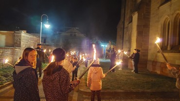 Manche von ihnen nutzen sogleich die Gelegenheit und bastelten eine Merci-Karte oder überlegten ganz konkret, wofür sie dankbar sind. "Danke!", sagte auch Paula, die aus Rumänien zugeschaltet wurde und von ihrer Arbeit für die Roma-Kinder in Siebenbürgen berichtete - und nachdrücklich deutlich machte, wie wichtig es ist, diese Kinder mit einer Spende zu unterstützen. Der Obstsalat-Verkauf im Anschluss an den Gottesdienst am nächsten Tag war genau hierfür gedacht. Das gemeinsame Spielen kam während des Tages nicht zu kurz und wurde am Abend mit einem Highlight veredelt: Zusammen mit der Freiwilligen Feuerwehr ging es mit einer Fackel in der Hand auf Nachwanderung ins Tiefgestade.