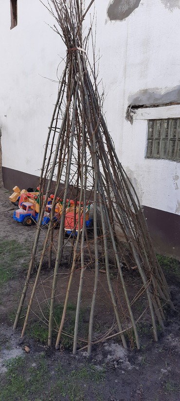Mitte Januar haben wir für unseren Kindergarten viele Weidenstämme geschenkt bekommen. Da der Kindergarten erneut wegen der Infektionslage geschlossen hatte, wurde die Zeit der Schließung genutzt, und der Bau eines Weidentipis wurde geplant. Auf unserer eigentlichen Rasenfläche, auf der auch nach mehrmaligen Versuchen kein Gras mehr wächst, wurde ein Platz für ein Tipi schnell gefunden.