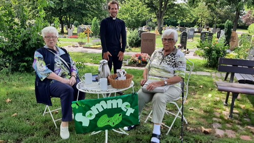 In Ruhe Kaffee trinken und ein Schwätzchen mit dem Pfarrer halten - viele Gemeindemitglieder nutzten an den vergangenen Sonntagnachmittagen, trotz Hitze, diese Gelegenheit und kamen auf den Neureuter Hauptfriedhof. „Wir wollen als Kirche dort sein, wo auch die Menschen sind – und ihnen eine kleine Freude machen.“, erzählt Pfarrer Würfel und freute sich zusammen mit den Kirchengemeinderäten über einige interessante Begegnungen.