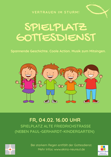 Zu einem besonderen Gottesdienst im Freien laden die katholische Kirchengemeinde Karlsruhe Hardt und die evangelische Kirchengemeinde Neureut-Nord am kommenden Freitag, 04.02. um 16:00Uhr auf den Spielplatz neben dem Paul-Gerhardt-Kindergarten in Neureut ein. Eingeladen sind alle große und kleine Leute, die Lust auf eine spannende Geschichte, Musik zum Mitsingen und eine Menge Action haben. An diesem Freitag spielen ein Fallschirm, ein Schiff und ein Sturm eine große Rolle