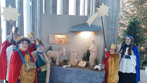Ganz in natura standen sie da: sechs Königinnen und Könige in vollem Gewand vereint neben der Holzkrippe auf dem Hauptfriedhof. Gekommen waren sie zum "Weihnachtsgottesdienst an der Krippe“ am ersten Sonntag nach Weihnachten, den Pfarrer Würfel (Liturgie und Texte), Elisabeth Pechlof (Evangeliumslesung) und Sybille Häfele und Kathrin Leuprecht (Musik) gemeinsam mit den EngelstänzerInnen der katholischen Kirchengemeinde (Sabine Pechlof-Brutscher) gestalteten. „Wir wollen Weinachten noch einmal hier in die Friedhofskapelle holen und auf das Licht schauen“, betonte Pfarrer Würfel und freute sich, dass der Premierengottesdienst gleich so gut angekommen war. „Eine schöne Idee!“, meinte eine Besucherin im Anschluss, „gerade weil sonst in dieser Kapelle so viel Schwere und Traurigkeit liegt. Heute war das ganz anders.“ Dafür sorgten nicht nur die TänzerInnen sondern auch die Sternsänger, die auf ihrer Route durch Neureut an diesem Nachmittag auch auf dem Friedhof Station machten. Das ein oder andere Geldstück fand anschließend auch den Weg in die Kasse – zu Gunsten der Kinder im Südsudan.