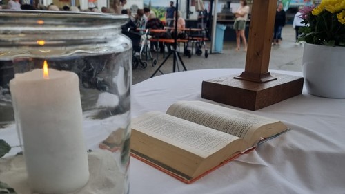 Auch wenn sich das Wetter am Sonntagmorgen nicht von seiner besten Seite zeigte, freuten sich die evangelischen Kirchengemeinden Neureuts und die katholische Kirchengemeinde Karlsruhe Hardt zusammen mit den Kerwe-Organisatoren über einen großen Zuspruch beim nun mehr zweiten Gottesdienst am Kerwe-Sonntag. Musikalisch umrahmt vom Musikverein Neureut unter der Leitung von Birgit-Hannig-Waag stellten Michel Kummer und Pfarrer Pascal Würfel den Marianna Rosenberg-Klassiker "Er gehört zu mir" als roten Faden in die Mitte ihres Nachdenkens über das, was zum Leben (nicht) selbstverständlich dazugehört. "Für viele gehört Gott zum Leben wie der Name an der Tür.", betonte Pfarrer Würfel in seiner Kurzpredigt und legte noch hinzu: "Entscheidend ist aber auch, dass wir alle zu Gott gehören und er seine Geschichte mit uns weiterschreibt." So wie der Name an der Tür gehört auch die Kerwe am dritten August-Wochenende zu Neureut, was eine große Anzahl an freiwilligen Helfenden und tolle Stimmung an den Kerwe-Tagen eindrucksvoll unterstrich. Der Dank dafür kam in den Fürbitten ebenfalls zum Ausdruck wie auch der Wunsch, dass es möglichst allen Menschen in Neureut möglich sein sollte, ein kleines Stück Auszeit auf der Kerwe geschenkt zu bekommen.