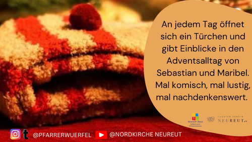 Ab dem 1. Dezember erwartet die Besucher des Instagram-Kanals von Pfarrer Würfel (@pfarrerwuerfel) und des YouTube-Kanals der Kirchengemeinde Neureut-Nord (www.youtube.com/@neureutnord5538) ein ganz besonderer Adventskalender. Gemeinsam mit Yvonne Pelliccia, der ersten Vorsitzenden des Theatervereins Neureut e.V., schlüpft Pfarrer Würfel in die Rollen von Sebastian und Maribel – einem Paar, das auf humorvolle und nachdenkliche Weise die kleinen und großen Herausforderungen der Adventszeit meistert. Jeder Tag widmet sich einem besonderen Thema rund um den Advent und wird in einer etwa ein minütigen Videosequenz präsentiert. „Wir wollten schon lange ein gemeinsames Projekt umsetzen, und die Adventszeit schien uns der perfekte Anlass zu sein“, erklären Pelliccia und Pfarrer Würfel. Die Idee für die Szenen liefern Alltagssituationen, die jeder kennt – mal zum Schmunzeln, mal zum Nachdenken. Die kurzen 24 Clips sollen inmitten des vorweihnachtlichen Trubels kleine Auszeiten schenken und gleichzeitig für gute Laune sorgen.