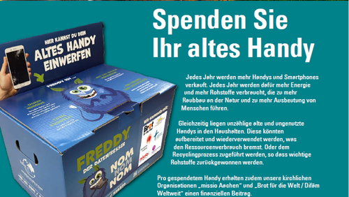Auch in der Kirche ist eine Sammelbox aufgestellt und können die Handy eingeworfen werden oder während der Öffnungszeiten (Mo-Do 9-12 Uhr, MI 15-18 Uhr) im Pfarramt abgegeben werden. Die Kirche ist täglich von 9 bis 17 Uhr geöffnet.