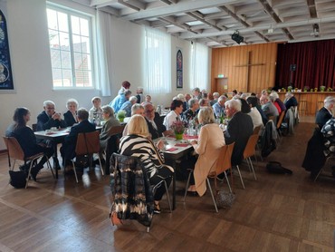 Im Anschluss an den Gottesdienst traf man sich im Gemeindehaus zu Kaffee und Kuchen. Die Eltern der diesjährigen KonfirmandInnen hatten ein großes Kuchenbuffet vorbereitet und so für einen gemütlichen Rahmen gesorgt. In entspannter Atmosphäre wurde erzählt, gelacht und über die Unterschiede der eigenen Konfirmandenzeit im Vergleich zu heute gesprochen. Während sich damals viele vor dem strengen Pfarrer fürchteten, sind heute offene Gesprächsrunden, gemeinsame Projekte und moderne Gottesdienstformen selbstverständlich. Einige brachten alte Fotos mit, zeigten ihre Konfirmationsurkunden oder erinnerten sich an Lieder und Verse, die sie damals auswendig gelernt hatten. Die Begegnungen über Generationen hinweg machten deutlich: Die Gemeinde lebt von dem, was bleibt, und von dem, was sich wandelt. So war dieser Tag nicht nur ein Rückblick, sondern auch ein Hoffnungszeichen für die Zukunft. Denn wenn Menschen unterschiedlichen Alters miteinander ins Gespräch kommen, Erfahrungen teilen und gemeinsam Glauben feiern, wird sichtbar: Kirche ist ein Ort für alle Generationen.