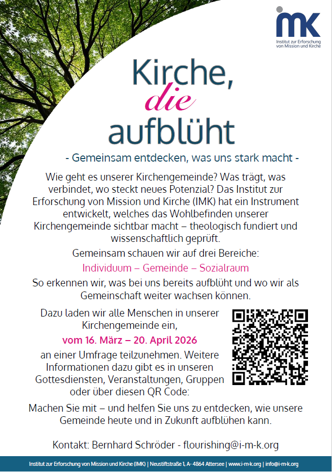 Wie geht es unserer Kirchengemeinde? Was trägt, was verbindet, wo steckt neues Potenzial? Das Institut zur Erforschung von Mission und Kirche (IMK) hat ein Instrument entwickelt, welches das Wohlbefinden unserer Kirchengemeinde sichtbar macht – theologisch fundiert und wissenschaftlich geprüft.