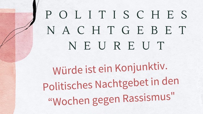 Das Politische Nachtgebet in Neureut greift unter dem Thema „Würde ist ein Konjunktiv.“ aktuelle Fragen unserer Zeit auf. In einer Atmosphäre von Gebet, Stille und kurzen Impulsen wird Raum gegeben, gesellschaftliche Entwicklungen im Licht des Glaubens zu bedenken. Das Politische Nachtgebet findet in den "Wochen gegen Rassismus" am Samstag, 14. März 2026, um 18.00 Uhr im Lutherhaus statt. Herzliche Einladung.