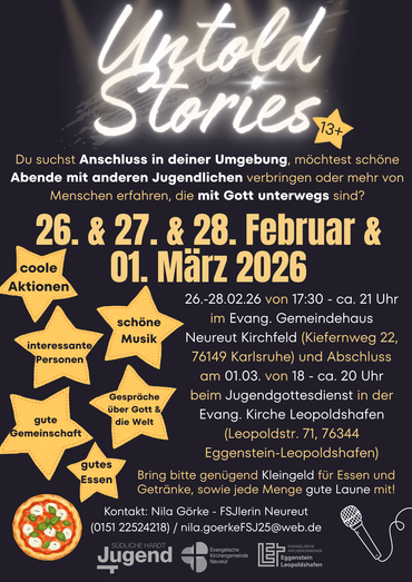 Am Sonntag, den 01.03., runden wir das Ganze noch mit dem Jugendgottesdienst um 18 Uhr in der Evang. Kirche Leopoldshafen ab.⛪️