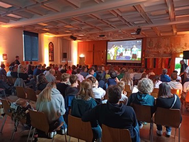 Der Stimmung im Saal - erst Recht nach dem erlösenden Ausgleichstreffer der deutschen Elf kurz vor Schluss - tat das allerdings keinen Abbruch. Zudem bereits beim Gottesdienst von Pianist Martin Nußbaumer „ein Hoch auf uns“ intoniert und gespielt wurde, und schlussendlich von allen Anwesenden auch mitgesungen wurde. So freuten sich die Organisatoren am Ende nicht nur über so viele helfende Hände, fleißige Mit-TipperInnen, ein ganz bunt gemischtes Publikum und die großzügige Spende von Coca-Cola, sondern auch über einen stattlichen Erlös der drei Abende, der einem KSC-Fanprojekt für benachteiligte Frauen zu Gute kommt. Auch wenn das Public Viewing zunächst pausiert - sollte Deutschland das EM-Finale erreichen, wird auch wieder zusammen Gottesdienst gefeiert und - hoffentlich - gejubelt.